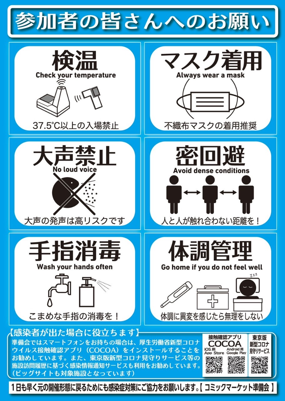 為了讓參加者安心逛場,Comiket 官方祭出防疫政策,一般參加者進場前須消毒手部、戴口罩、量體溫、分散排隊動線、入場票券採抽選制和實名制外,還要提供疫苗接種證明或 PCR 檢測證明,並貫徹「3 密」避開密閉空間、人群密集、密切接觸,並避免大聲喧嘩(可能造成飛沫傳染)。