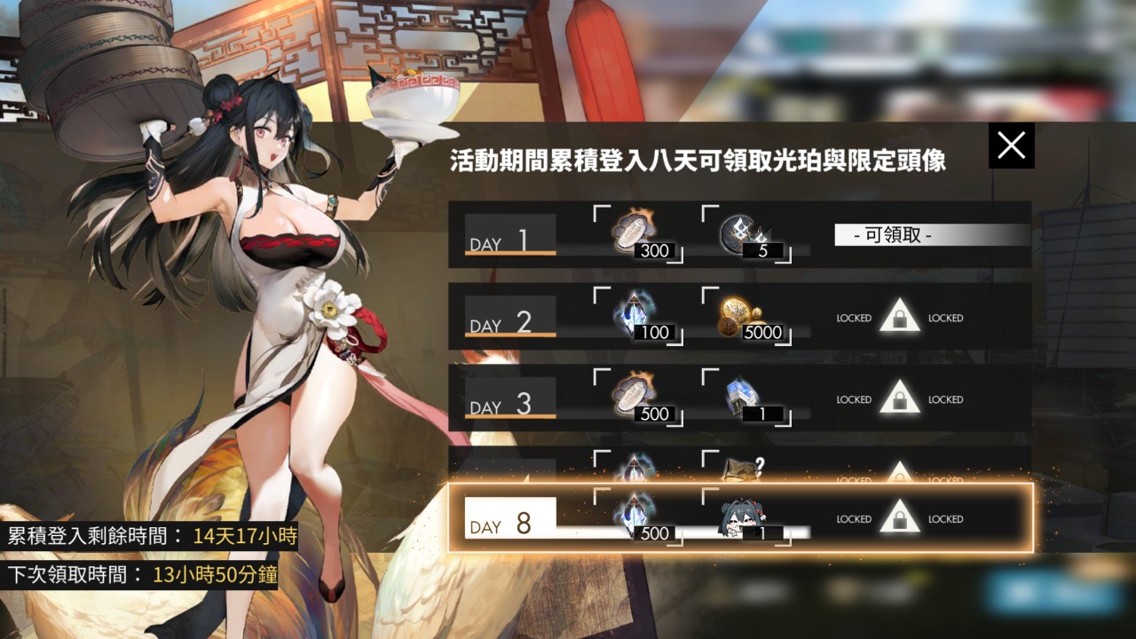 累積登入 8 天:光珀 x 500、「饕餮之瑤」(活動專屬頭像) x 1