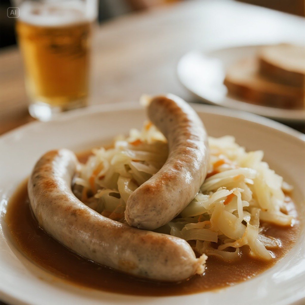 白香腸配酸菜(Weisswurst mit Sauerkraut)-慕尼黑特色香腸,以小牛肉製成,…
