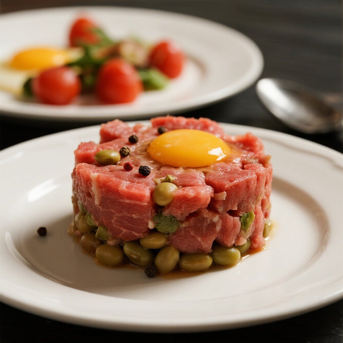 塔塔牛排(Steak Tartare) 生牛肉拌蛋黃、酸豆與香料,法國冷盤代表。