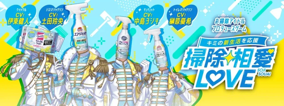日本著名日用品公司花王(KAO)即日起限時推出將清潔用品擬人化偶像遊戲《掃除相愛 LOVE》,讓玩家培養「打掃偶像」、享受遊戲樂趣同時,學習打掃基本知識與撇步。