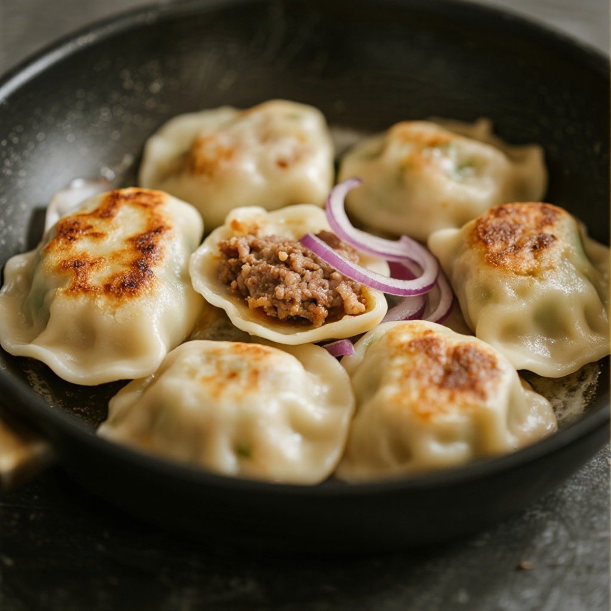 波蘭餃子佐肉餡(Pierogi z Mięsem) 麵皮包入絞肉與洋蔥煮熟或煎香,東歐家常味。