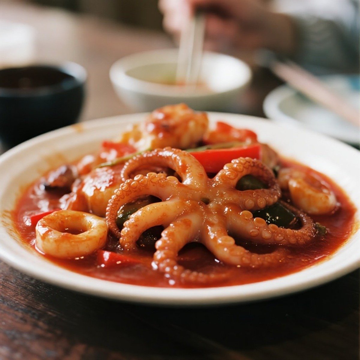 章魚與辣醬爆炒,Q彈辛辣,非常下飯。