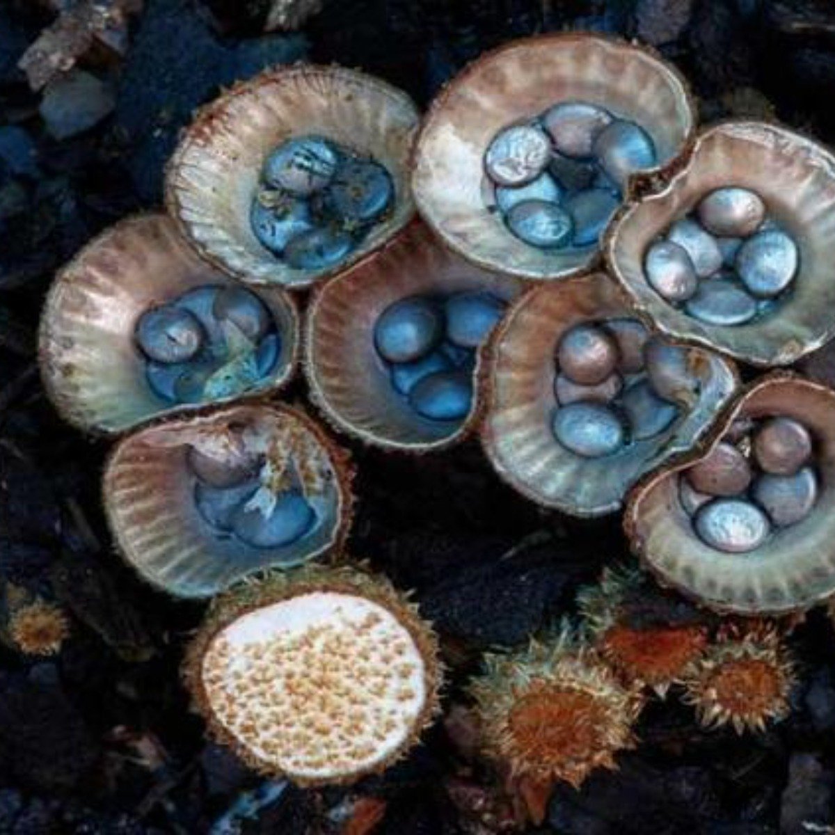 隆紋黑蛋巢菌:是種野生的菌類,它的藥用價值卻特別的高,可用於止胃痛。另外產生鳥巢素,對金色葡萄球菌有顯著抑制作用。其外形引人注目,在像杯子一樣的外形里還裝著一些孢子囊。這些細小的東西放在裡面,一個個就像一個縮小版的鳥蛋一樣。