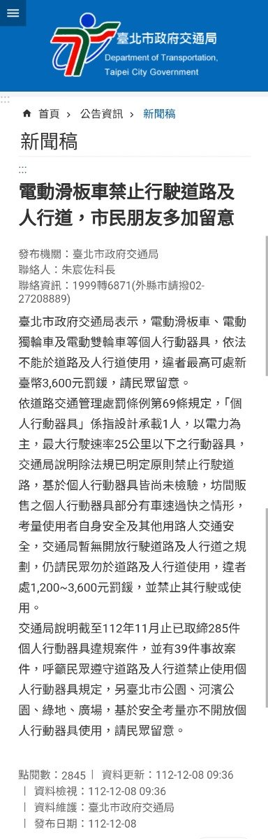 電動滑板車禁止行駛道路及人行道,市民朋友多加留意...另臺北市公園、河濱公園、綠地、廣場,基於安全…