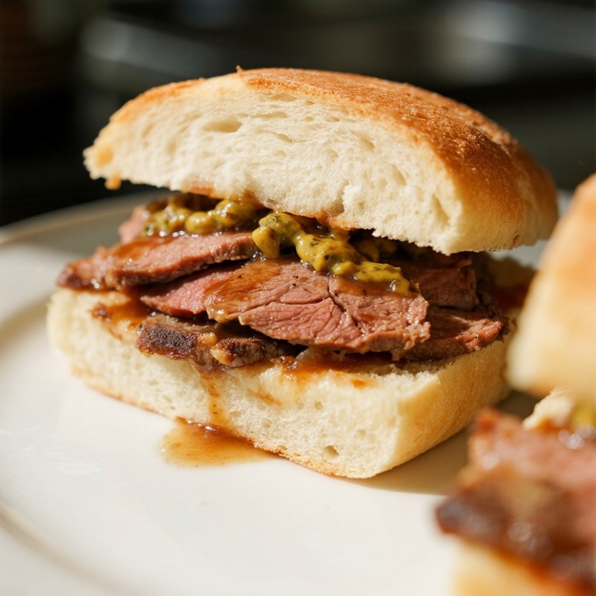 烤牛肉片夾麵包,搭肉汁或芥末醬。