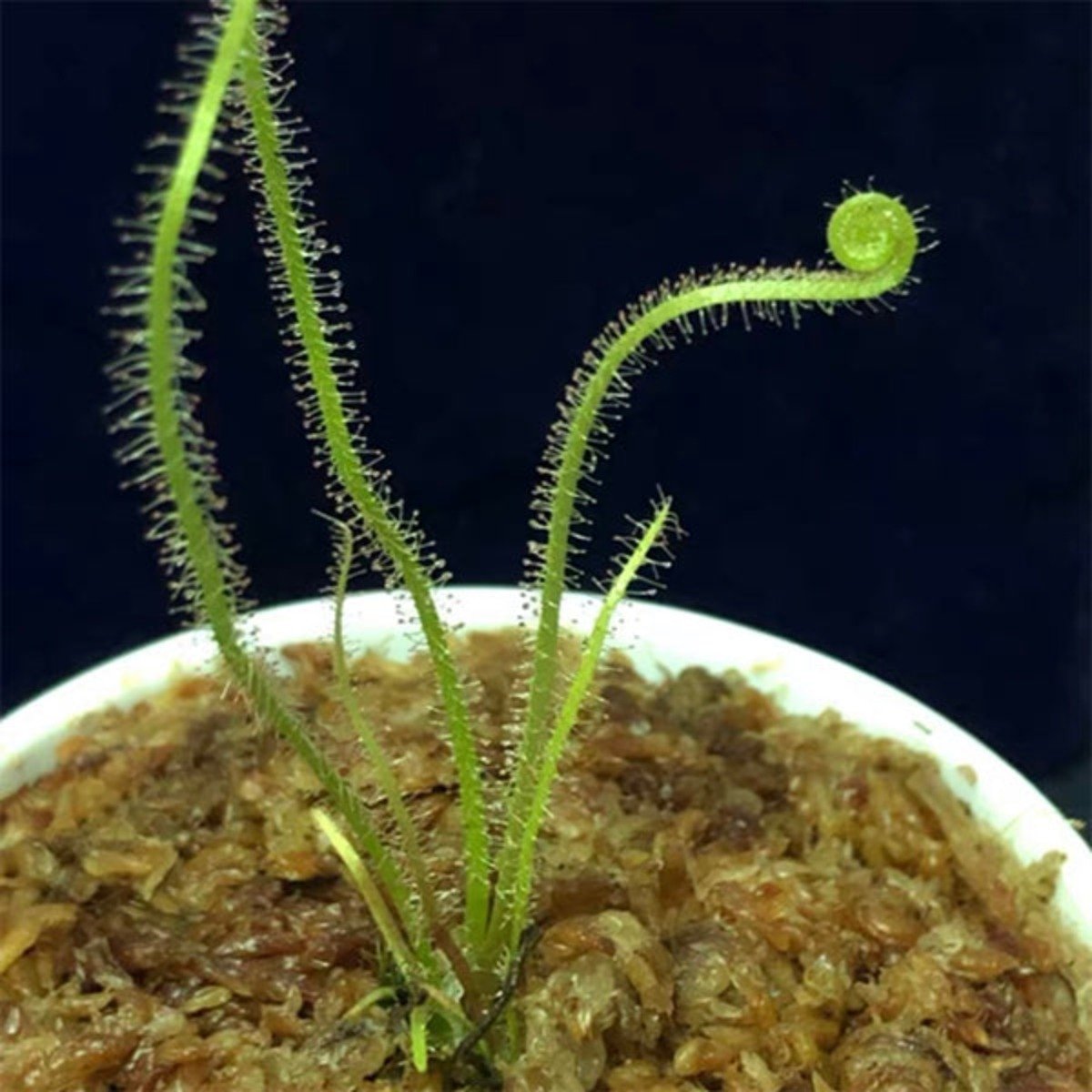絲葉茅膏菜:多種類,以原綠色的絲葉茅膏菜為代表,其中露松茅膏菜和紅絲葉茅膏菜最為著名。它們屬球根類茅膏菜,是茅膏菜中比較特別的大型品種。新芽會像蕨類植物一樣成螺旋狀展開,變成細長的線形葉,葉面密密麻麻分部著充滿粘液的腺毛,看上去就像一條晶瑩剔透的珍珠串。由於其類似蕨類植物一樣的出芽方式吸引了大批食蟲植物愛好者和花卉愛好者收藏,原產地為美國一些溫暖潮濕的地區。