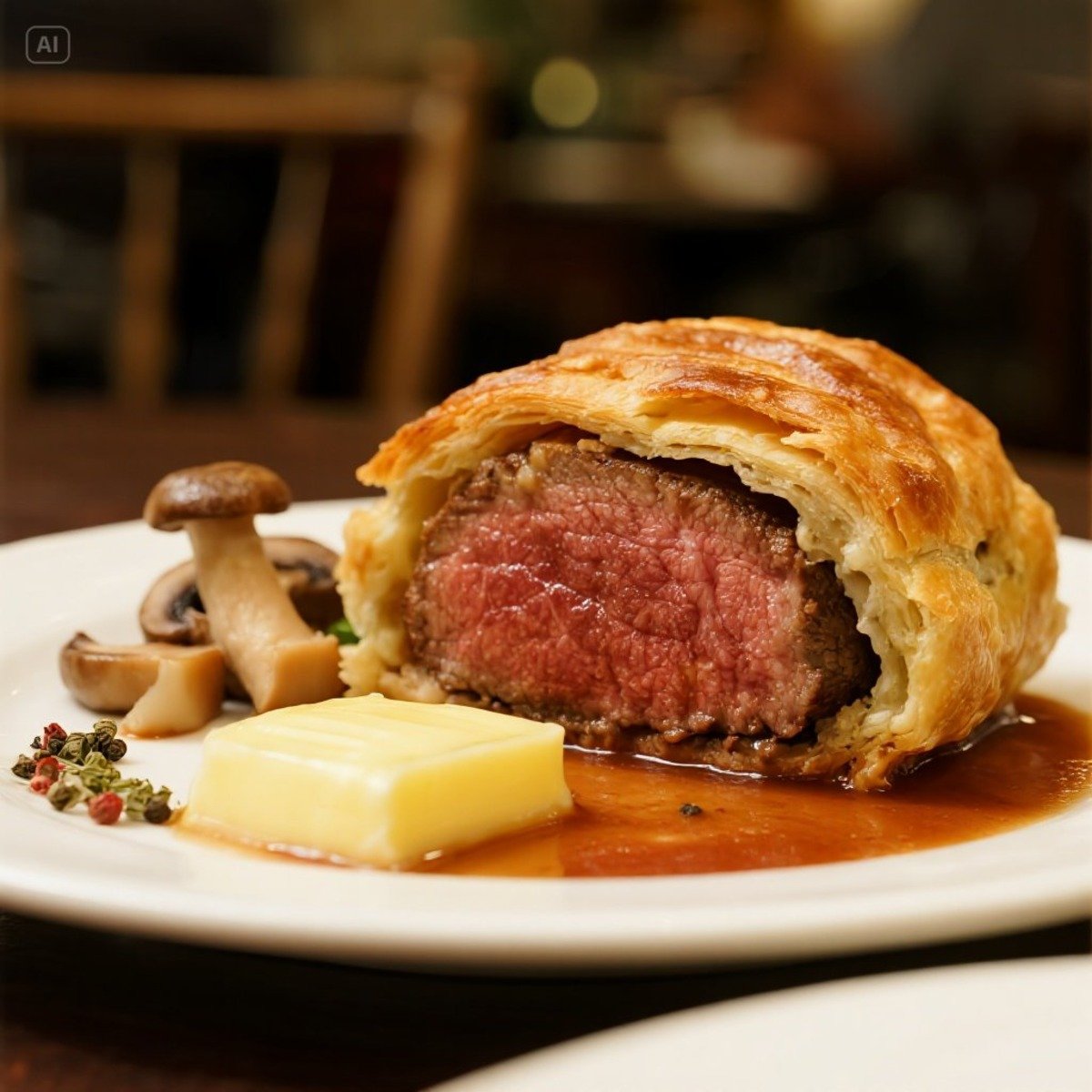 威靈頓牛排(Beef Wellington)-牛菲力包裹蘑菇泥與酥皮烤製,奢華經典。