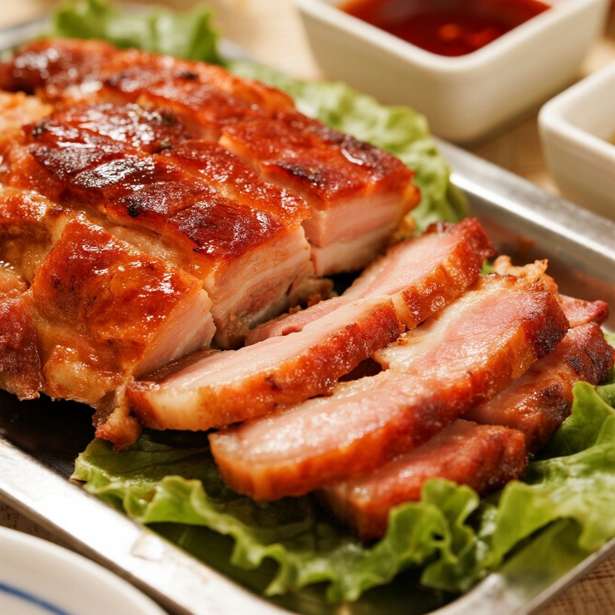 以蜜汁、醬油與香料醃製後烤成外焦內嫩,是廣東燒味代表。
