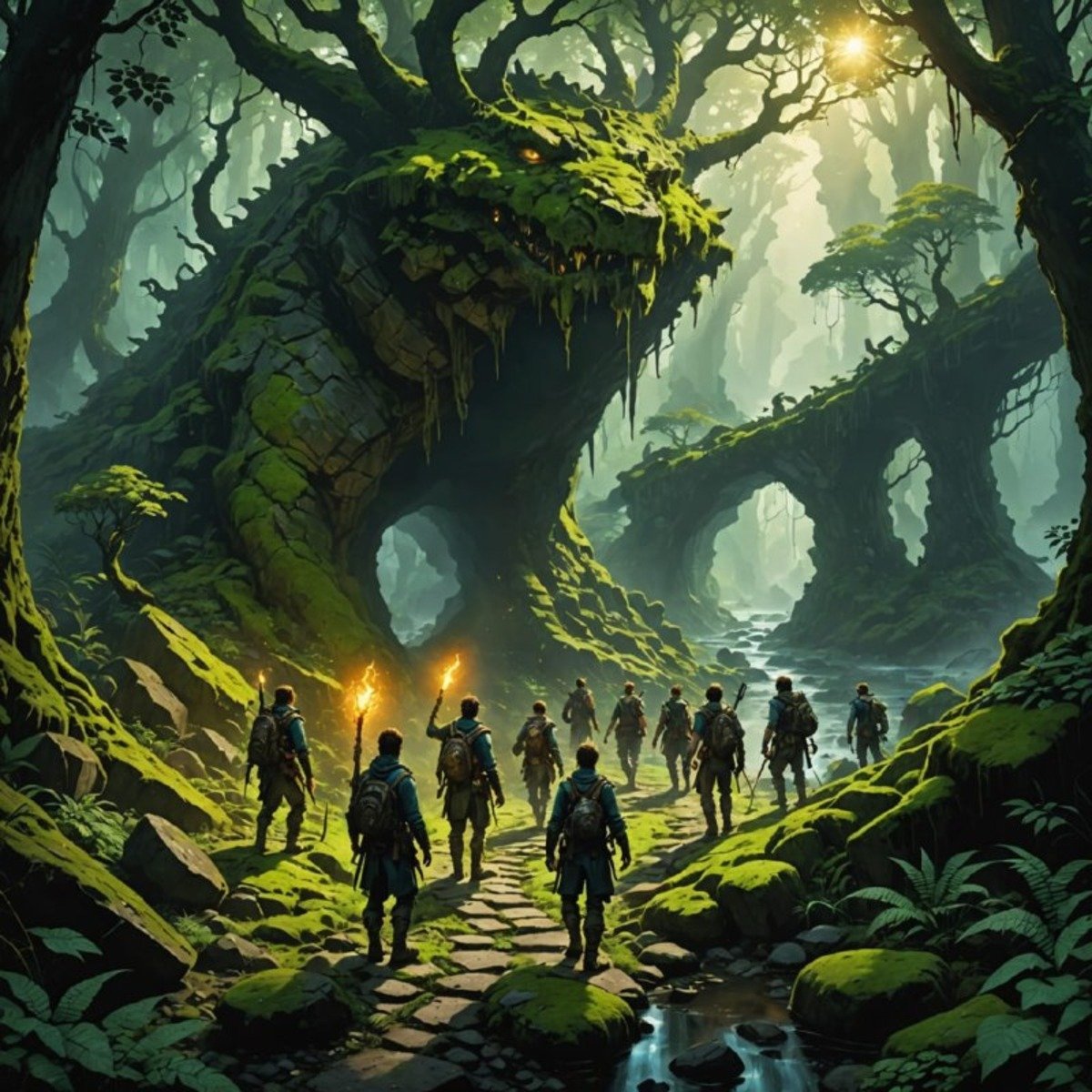 艾瑞克和他的同伴們踏上龍之島,四周被濃密的森林環繞。他們沿著一條古老的石板路前行,最終來到了一座巨大的山洞入口。山洞內傳來低沉的呼吸聲,似乎有某種強大的存在正在等待著他們。