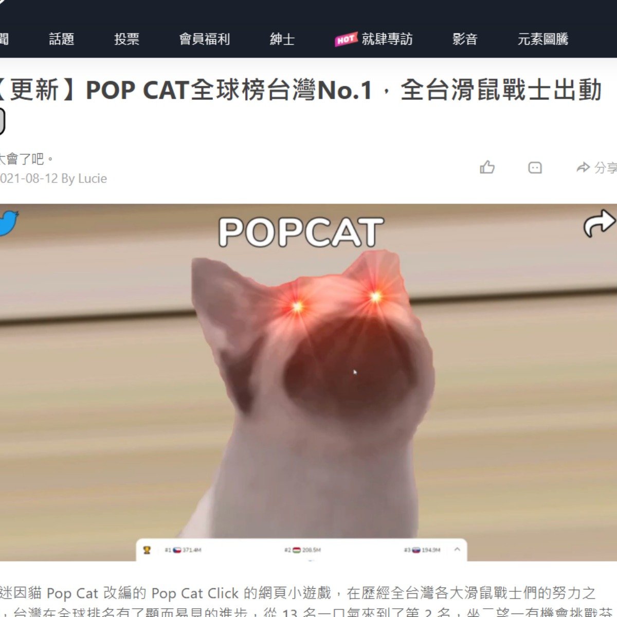 印象最深刻的4Gamers流行迷因新聞是POP CAT全球榜台灣No.1,全台滑鼠戰士出動🖱️ 因為我自己也有參與到 非常辛苦XD https://www.4gamers.com.tw/news/detail/49476/pop-cat-click-3-hours-asmr-video