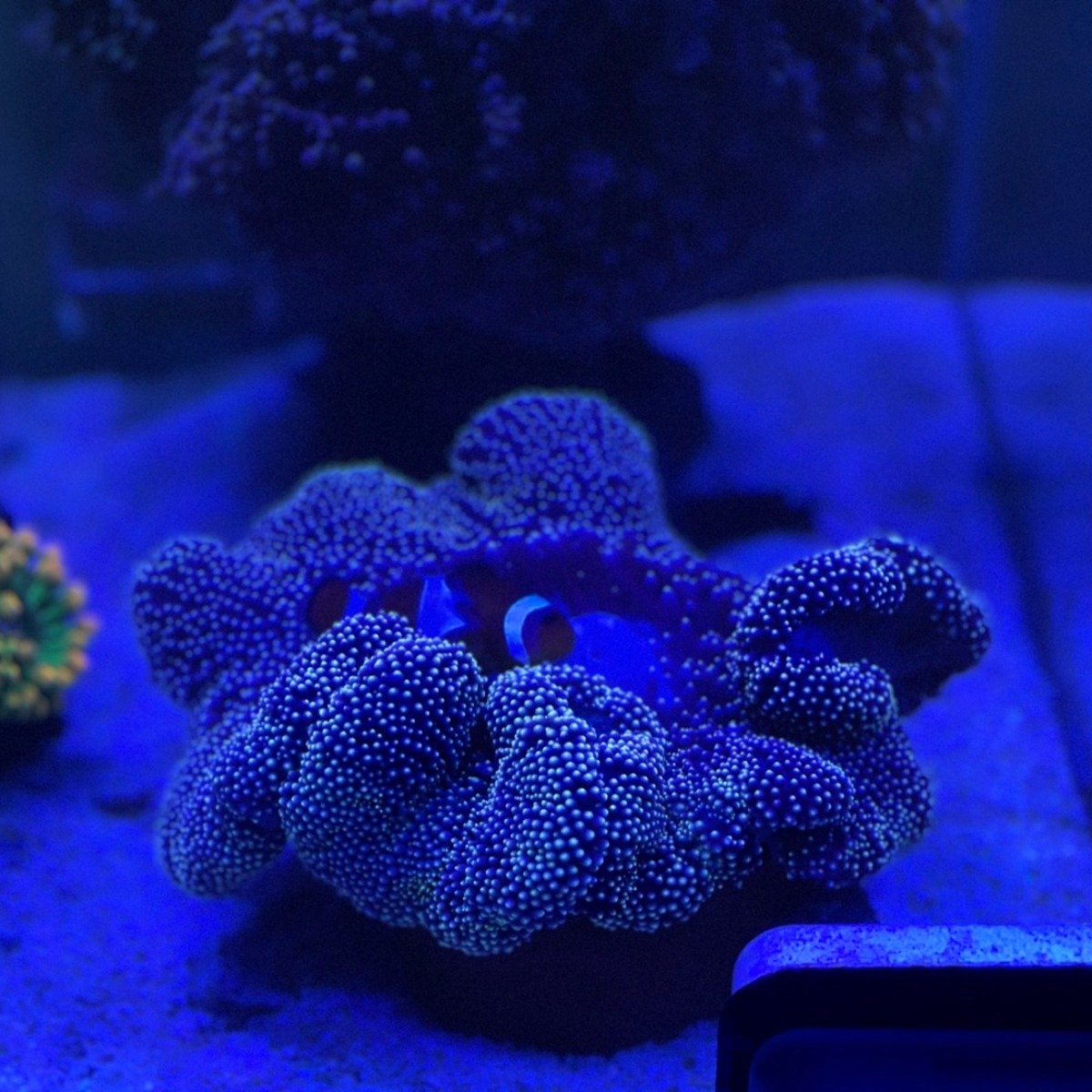 歡樂星期五~ 來點不一樣的吧 --- 今天的主角"巨星-小丑魚"&"小丑魚的家-地毯海葵" 地毯海葵的體型碩大,身上佈滿觸手,像地毯一樣,邊緣略捲曲呈波浪狀。 地毯海葵可以作為很多小丑魚的宿主,作為交換,小丑魚會提供給食肉海葵各種食物,維持它的大部分生長需要。 --- 藍燈底下顏色不一樣呦。