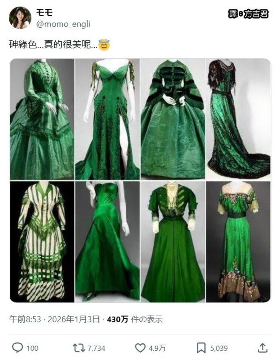 鮮豔的 砷綠色 這類顏料的核心成分是砷(俗稱砒霜)與銅的化合物 流行的年代是在 19 世紀(約 1800 年至 1900 年間) 看到了 閃遠點..