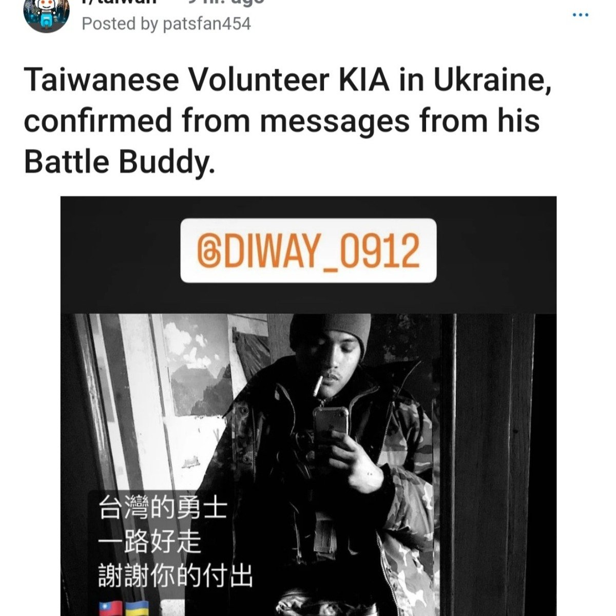 有個悲傷的消息,多方消息表示,有台灣在烏克蘭的志願兵犧牲了,榮譽歸於台灣勇士, R.I.P https://www.reddit.com/r/taiwan/comments/yls0dl/taiwanese_volunteer_kia_in_ukraine_confirmed_from/