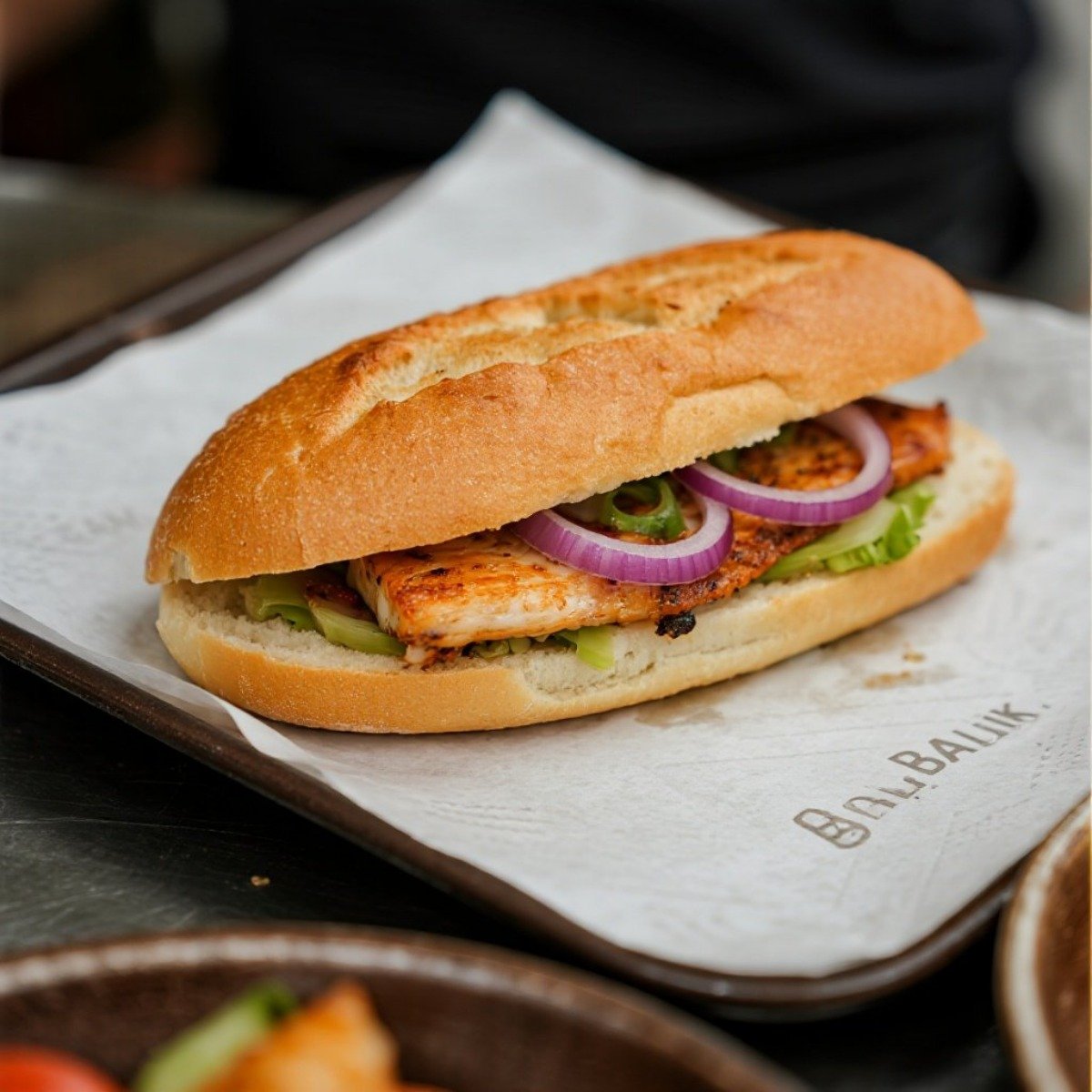烤魚三明治(Balık Ekmek) 烤魚夾麵包配洋蔥與蔬菜,是伊斯坦堡街頭名物。