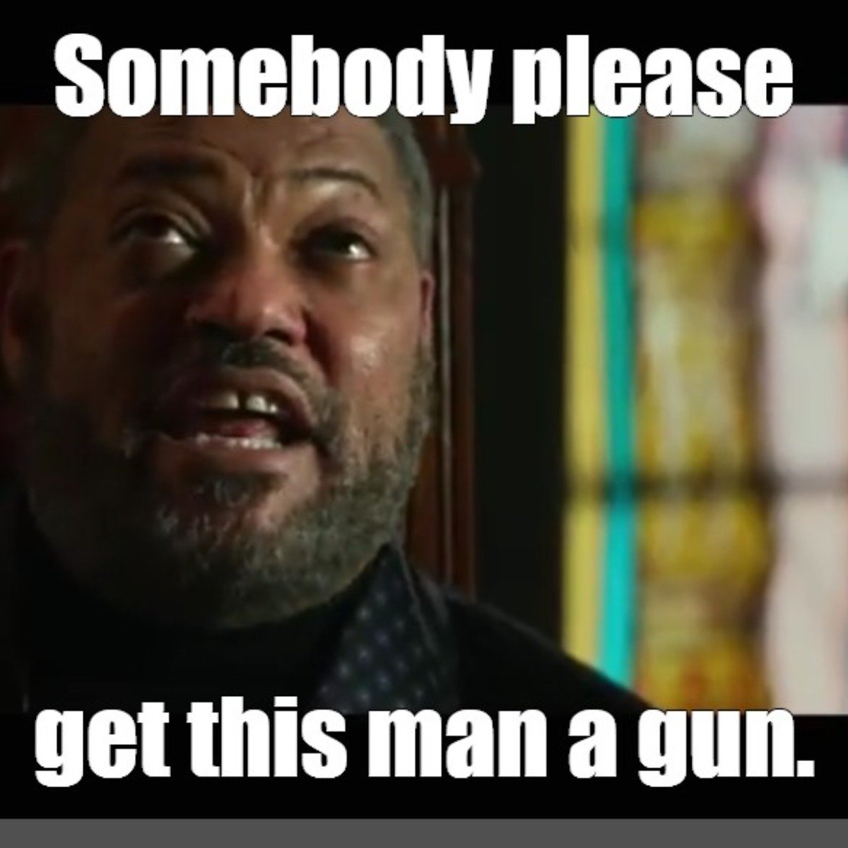 打一句有聲音的電影台詞 "Somebody please get this man a gun!"出自駭客任務,後來捍衛任務也有致敬😏 真的太帥了