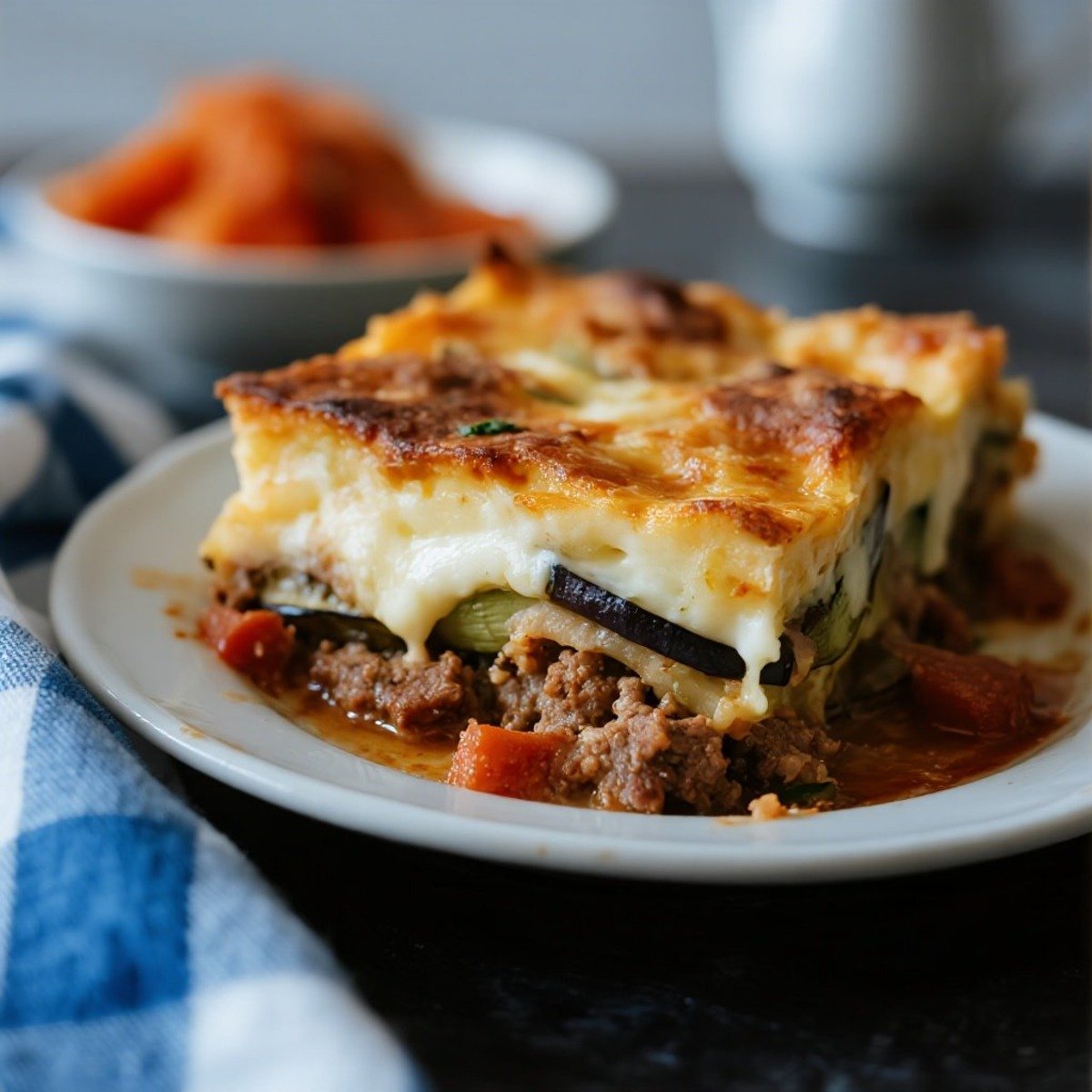 慕沙卡(Moussaka) — 羊肉末、茄子與奶油白醬層層堆疊烘烤,希臘版千層料理。