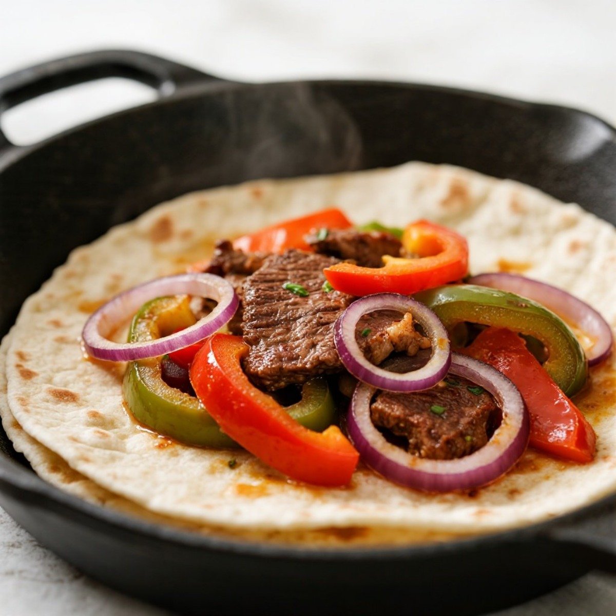 牛肉法士達(Beef Fajitas) 鐵板炒牛肉配彩椒與洋蔥,夾餅食用。