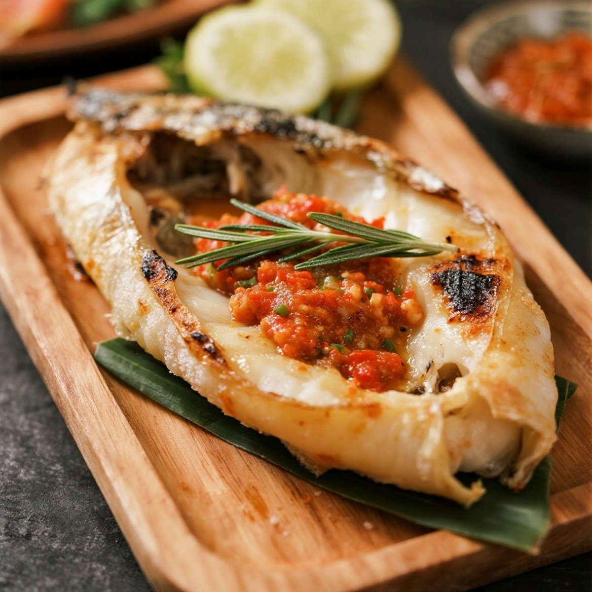 泰式烤魚(Pla Pao) 整條魚裹鹽炭烤,內部鮮嫩,配辣醬與香草。