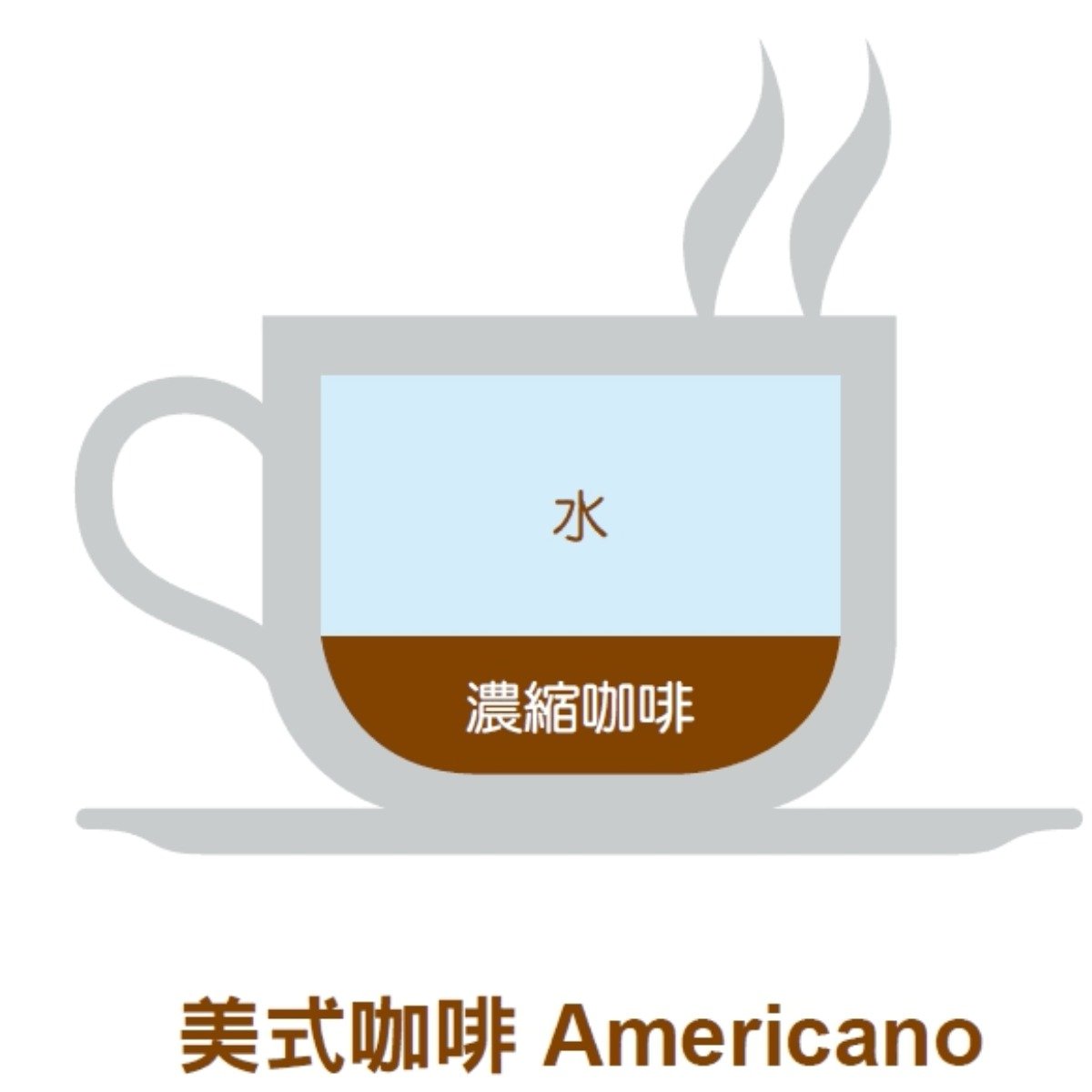 美式咖啡Americano 可以說是黑咖啡的總稱。無論是法式濾壓壺或是手沖壺沖煮出的咖啡都可泛稱為美式。在義大利,美式咖啡通常就是Espresso旁邊放上一杯熱水任你添加,濃縮咖啡與水的比例視個人口味而定,大約為1:12,美式咖啡喝起來口味偏淡,沒有義式濃縮咖啡強勁的口感,當然也更容易讓不喝咖啡的人接受。容量:360ml 沖泡時間:30秒 咖啡因:★★★☆☆