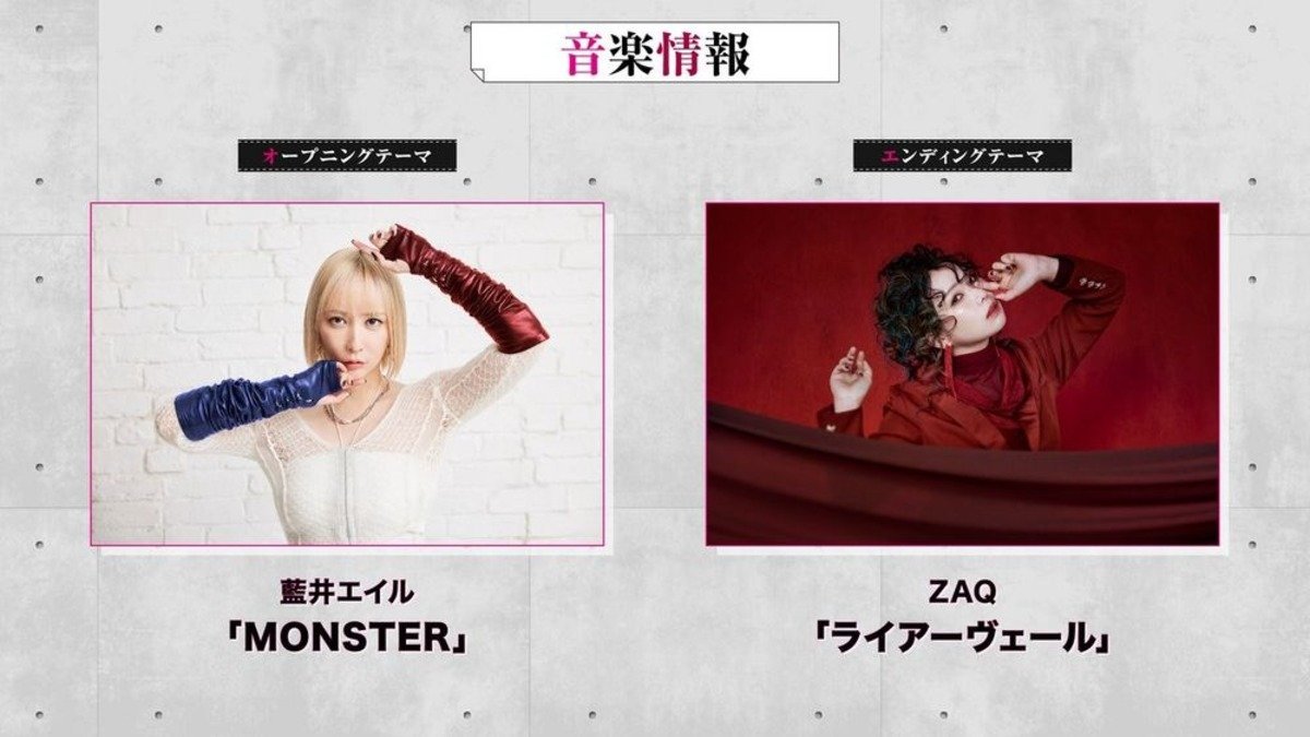 主題曲部份,片頭主題曲「MONSTER」、片尾主題曲「LiarVeil」將分別由 藍井艾露 和 ZAQ 負責演唱。從這次所釋出的第二波宣傳影片中,也能聽見主題曲的部份音源。