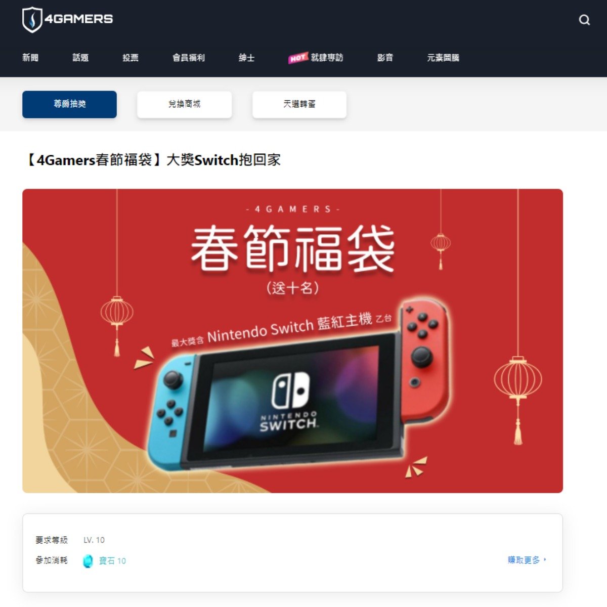 【4Gamers春節福袋】大獎Switch抱回家 這次的活動一級棒~ 花10寶石買夢想~