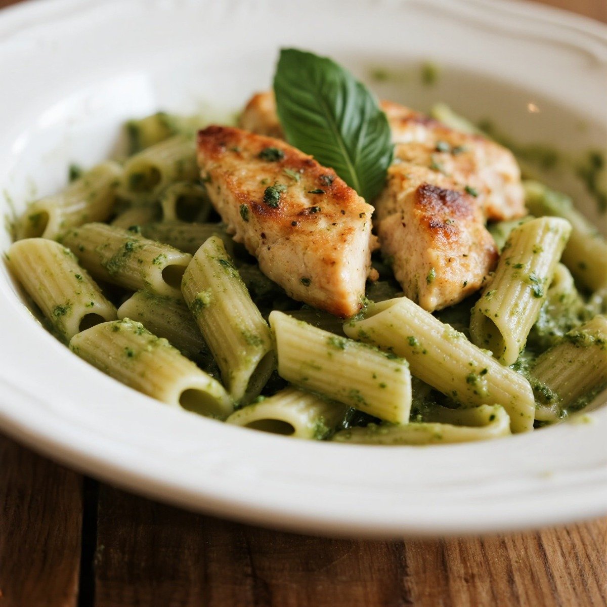 熱那亞青醬雞肉義大利麵(Pesto Chicken Pasta) — 羅勒青醬結合煎雞肉,清香帶肉…