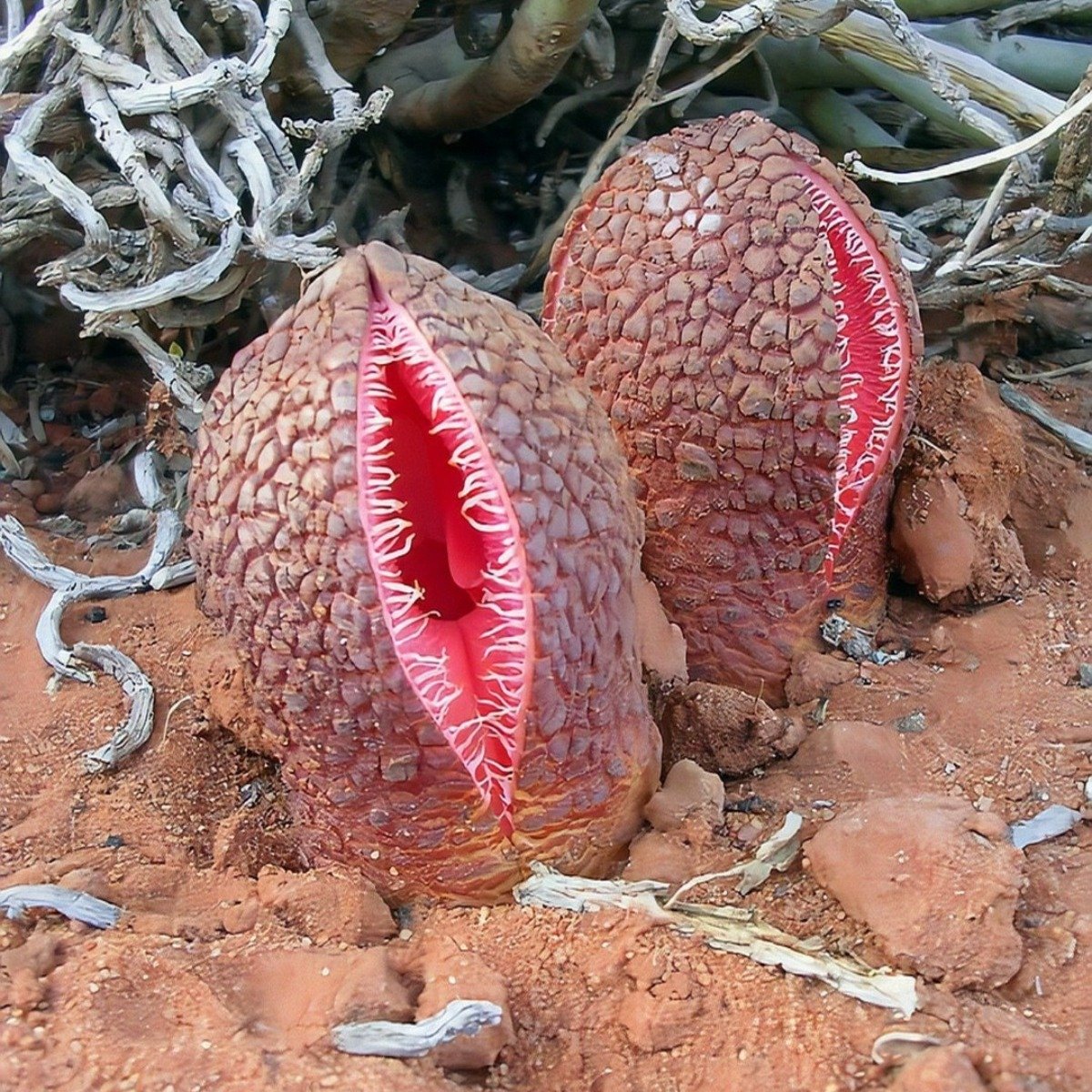 全株無葉綠素,長年只在泥中生長,只有散發含硫化物,氣味如糞的肉質花會在暴雨後露出地面,