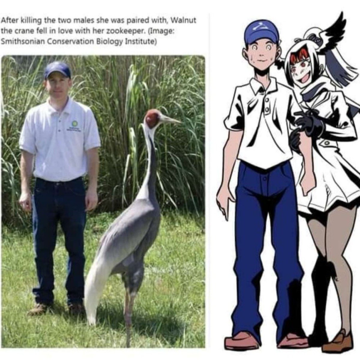 這是一段真實的人鶴戀故事,名叫核桃的雌性白鶴愛上了從小照顧牠的人類飼養員,因為白鶴是瀕危的稀有動物,所以飼養員無奈的跟核桃 跳起求偶舞,並用人工受精的方式養大好幾隻小鳥,由於白鶴是終身一夫一妻,所以這位飼養員是被核桃跟定一輩子了!