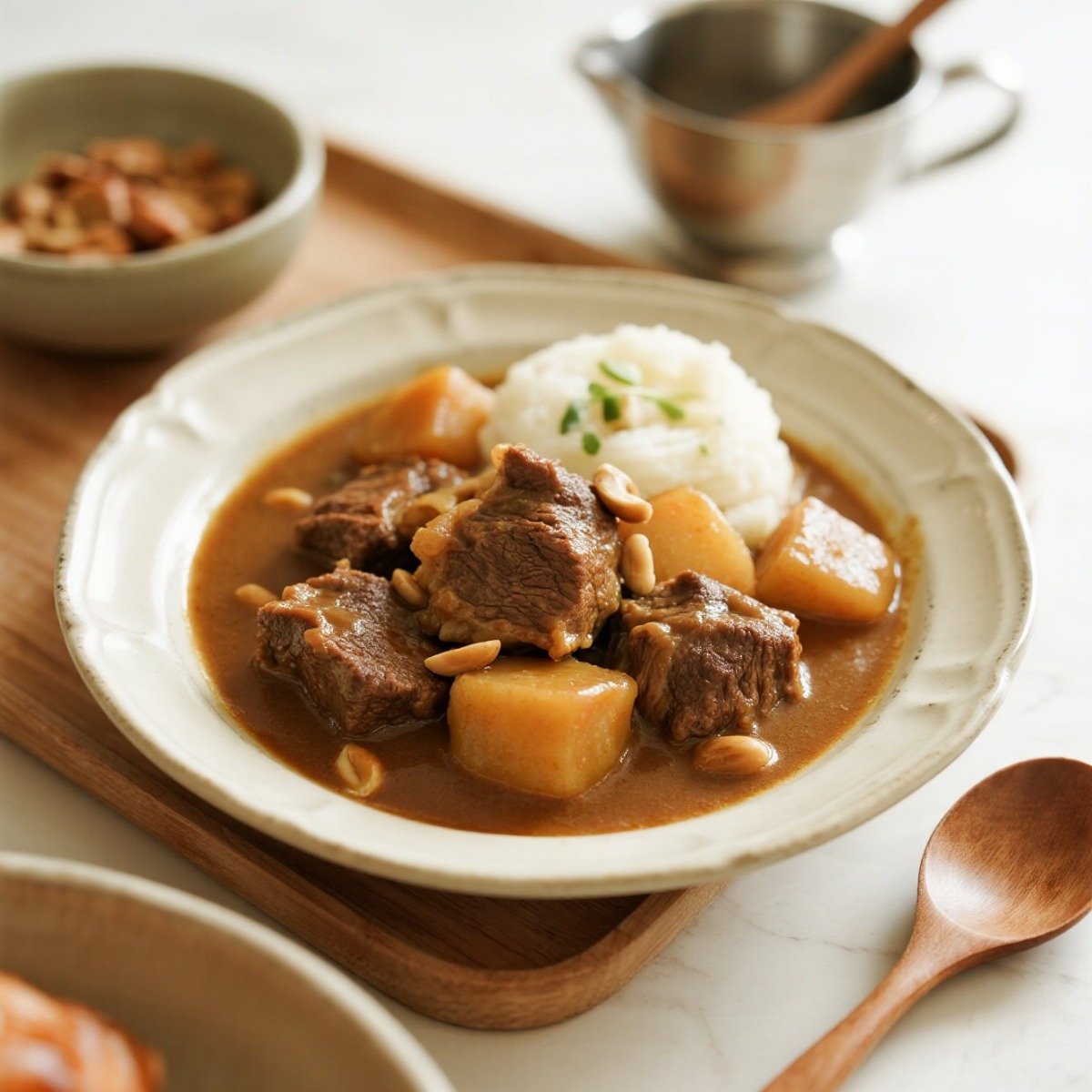 瑪莎曼牛肉咖哩(Massaman Beef Curry) 融合泰式與穆斯林香料的溫和咖哩,牛肉軟爛、帶堅果香氣。