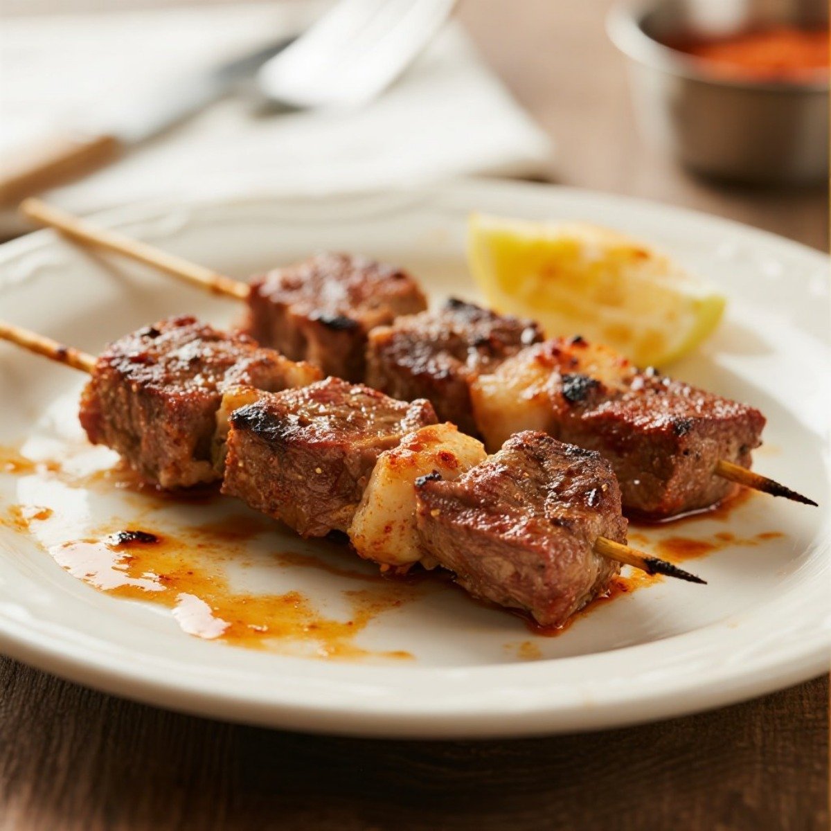 秘魯牛心串(Anticuchos) 牛心切塊串烤,香料濃郁,是傳統街頭小吃。