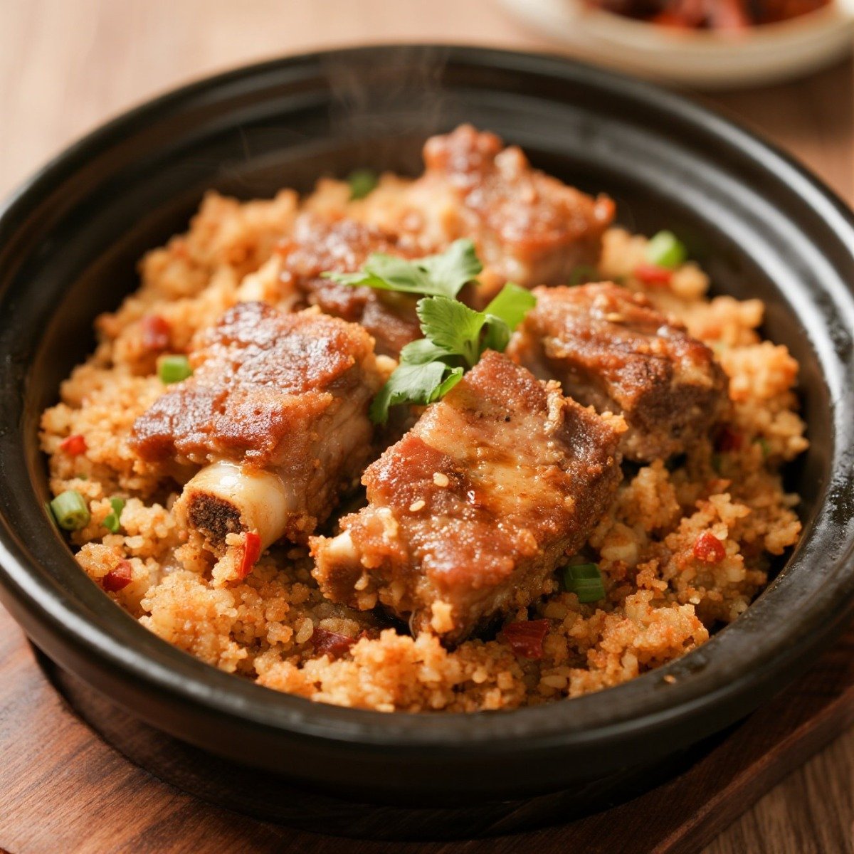 粉蒸排骨 — 豬排骨裹米粉與香料蒸製,肉質軟嫩、米粉吸滿肉汁。