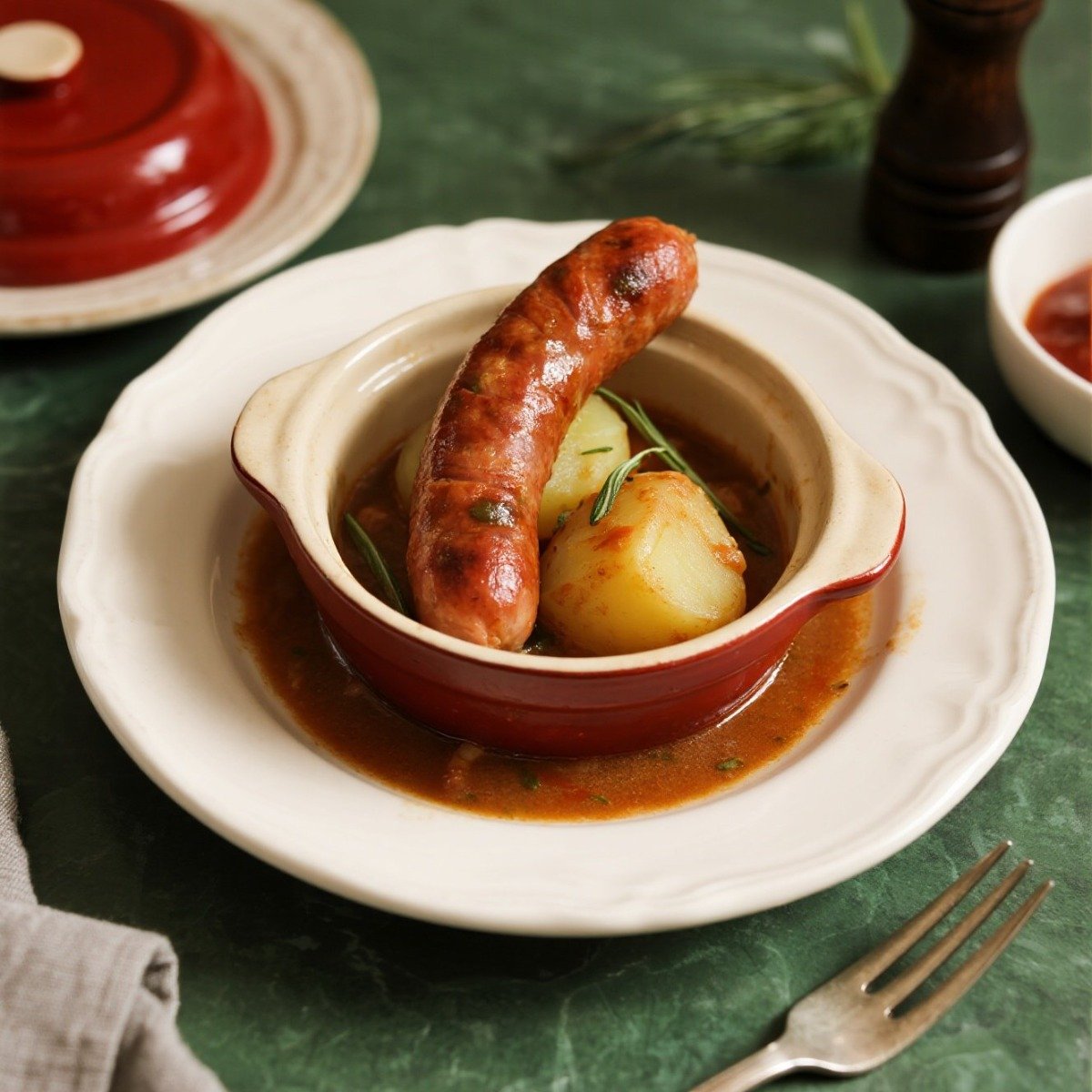 里昂香腸燉菜(Saucisson de Lyon en Cocotte) 粗豬肉香腸與馬鈴薯、紅酒一起燉煮,是法國里昂的傳統料理。