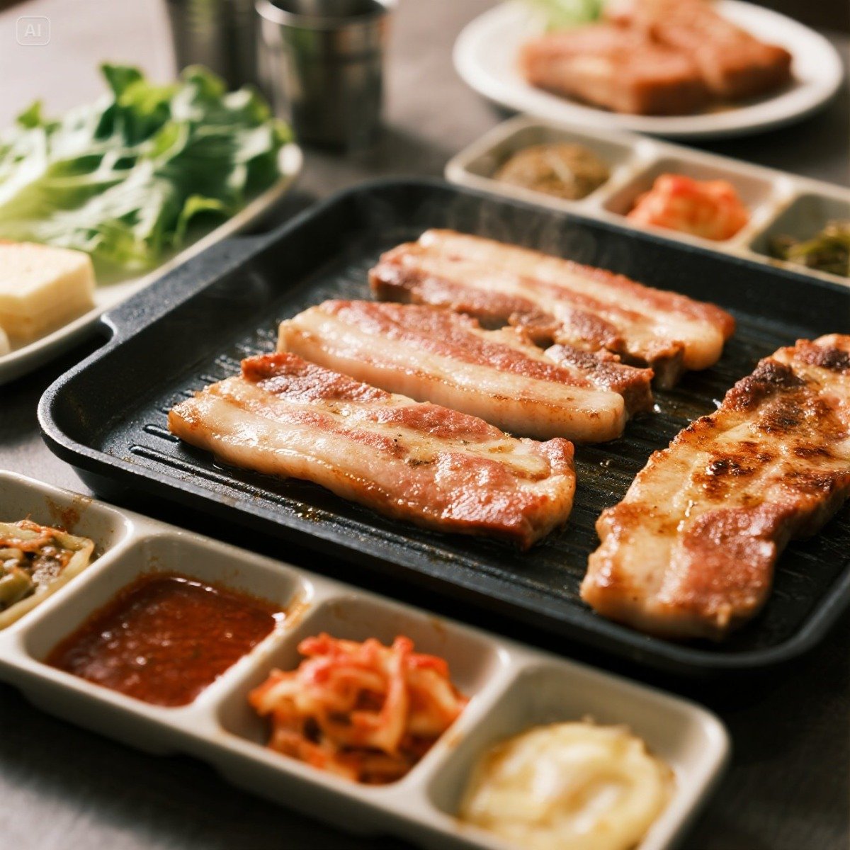 厚切豬五花在鐵板上烤至金黃,搭配生菜、泡菜與醬料,是韓國聚餐人氣美食。