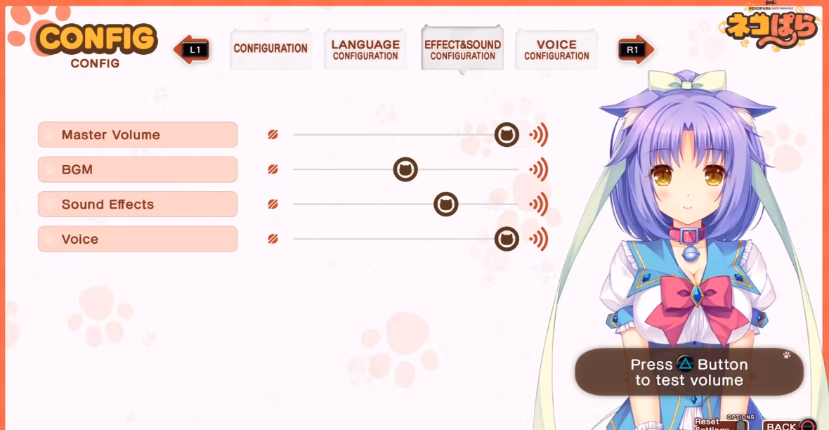 當玩家進入 CONFIG 設定頁面,在音效設定那邊逐一往下選擇,即可選到「隱形的」乳搖強度設定,雖然看不見,還紳士們能自行靠感覺來測試強度。