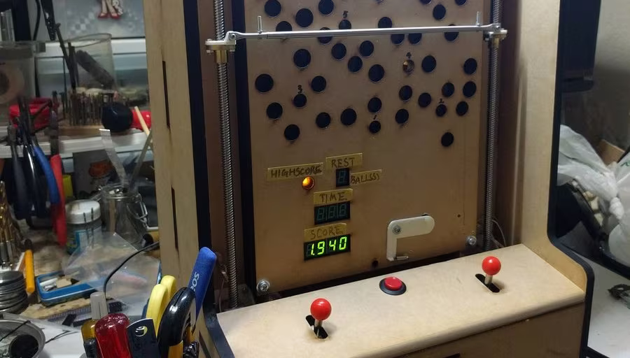 由日本達人 noguo 所自製的這台土炮彈珠台命名為「Secrets of the Deep」,他利用螺線管與 Arduino 電路板微處理器和控制器設計,可藉由左右手把控制平台升降,小心翼翼讓台上的彈珠不要落入孔內,只要落入正確的洞口即可得分。