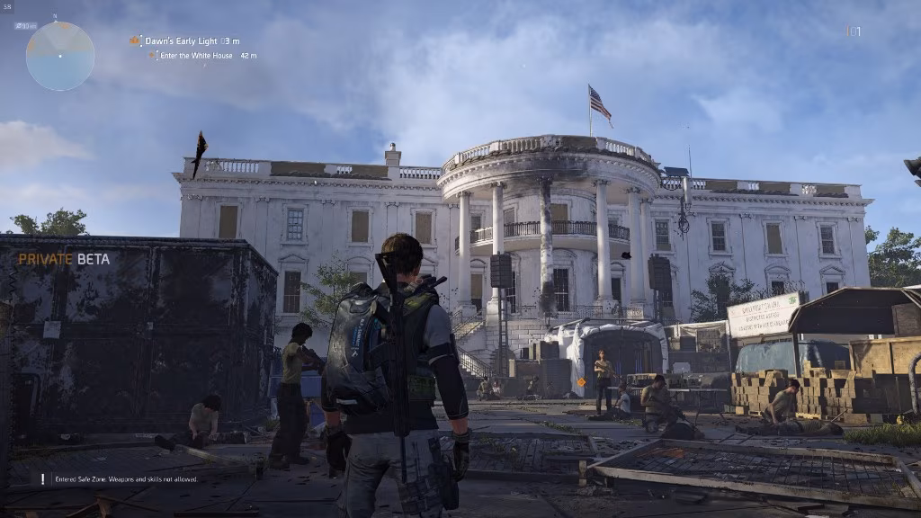 本次封測,玩家依然扮演國土防衛局(The Division)的特工,得知白宮當時是由 JTF 連合部隊所駐防,玩家必須協防白宮,並且能與初期一些 NPC 打過照面。