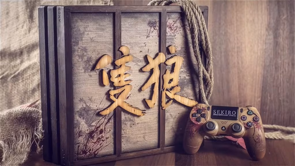 這是一台相當別緻特殊樣式機,以 PS4 Pro 為基底,採深色仿木框架,主機上蓋具顯眼的「隻狼」二字立體木刻。類似竹簾般的背景,斑斑血跡展現有如《隻狼》主角的手起刀落,快意殺敵。