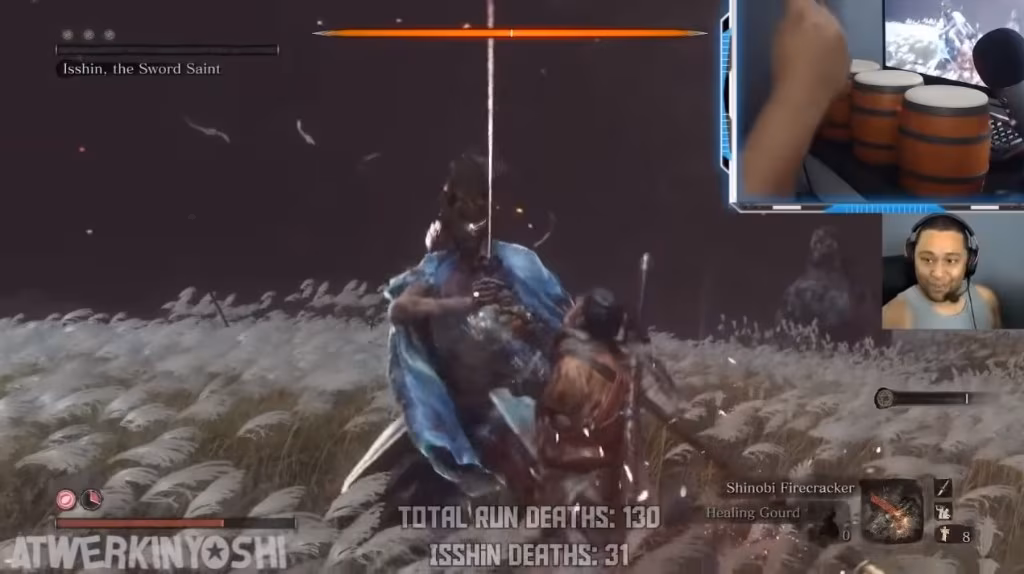 ATwerkingYoshi 擅長透過模改音樂遊戲的控制器遊玩動作遊戲,先前就曾經用大金剛鼓玩同屬「魂系列」的《黑暗靈魂 3》,《隻狼》推出後不免俗的也要嘗試一下。但身為英高哥哥善意爆滿(無誤)的遊戲,確實也讓 ATwerkingYoshi 打了一場苦戰,挑戰計畫全程超過 10 個小時,使用 131 次復生,死了 31 次。