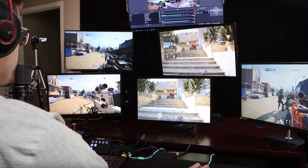 Basically Homeless,這位 YouTuber 就想這麼幹,Rank KDA 2.02 的他,心裡想著如果他能夠一人操作其他隊友,換句話說就是有五個一樣厲害的自己應該能所向披靡,於是他透過轉換器連接 5 台電腦(對,應該都是他自己買的),每台電腦都連上專屬的《虹彩六號:圍攻行動》遊戲。