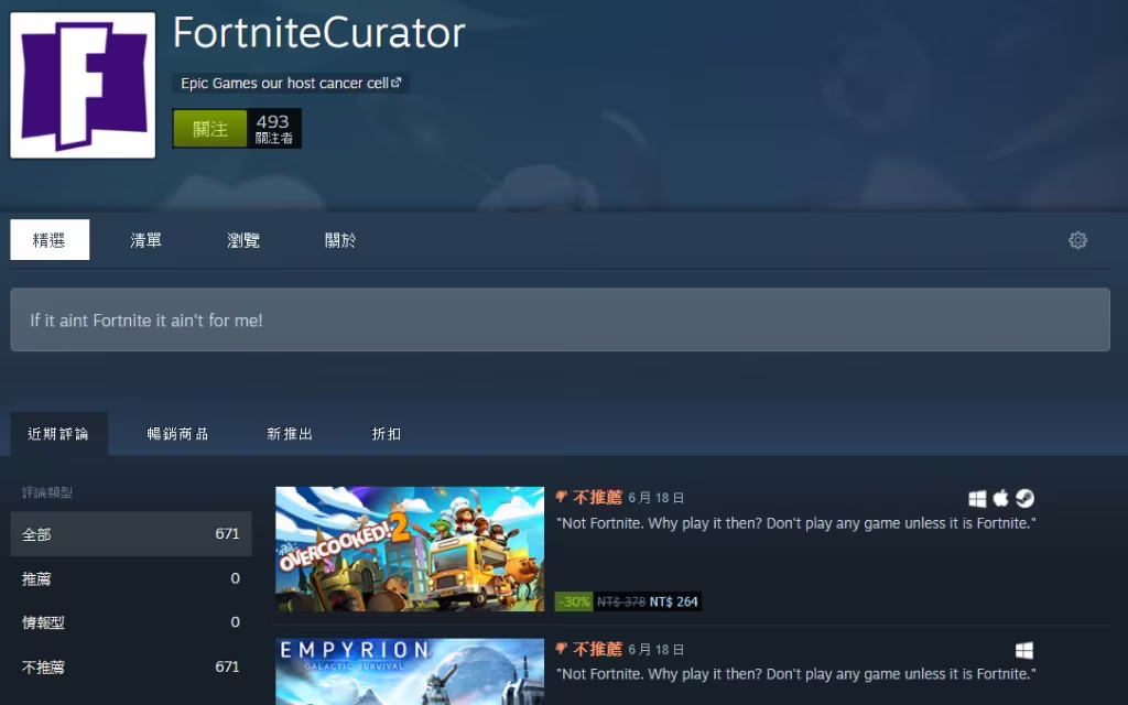 FortniteCurator,去年 10 月建立的 Steam 鑑賞家,向來關注的是開放世界、大逃殺、玩家對戰、搞笑與建造類向的遊戲,只不過在他的鑑賞專頁中,你找不到任何一款他推薦的遊戲。