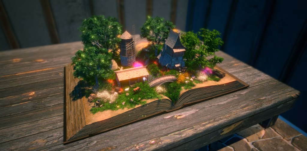 遊戲中有 20 種起始點,小村落、沙灘、河流、湖泊,從一本空白的書開始,翻開書頁開始作畫,利用內建的素材庫,有樹木、岩石、鮮花等植物類,也可加入房屋、堡壘,搭建出任何你想要的場景。雖然沒有內置角色,但遊戲支援自行導入素材,只有你想不到,沒有做不到的!