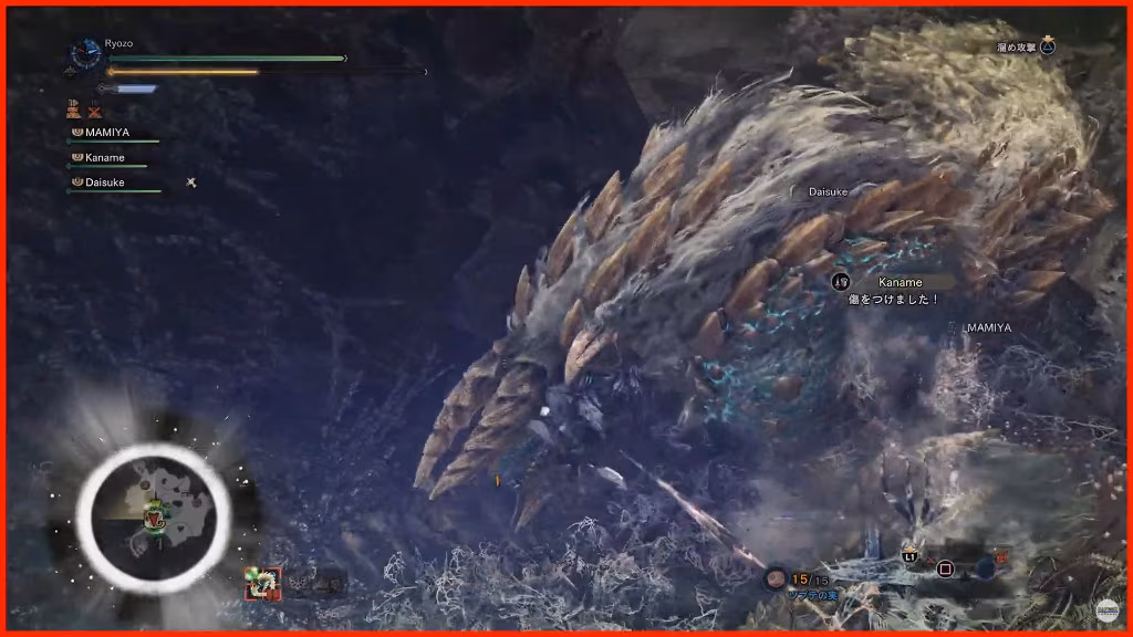 隨後進入今天的重頭戲之一,也就是間宮祥太郎與《魔物獵人》系列總監过本良三等開發團對共同四人挑戰雷狼龍,可以看到將雷狼龍擊倒後的短暫時間內可在牠身上抓到「超電雷光蟲」。