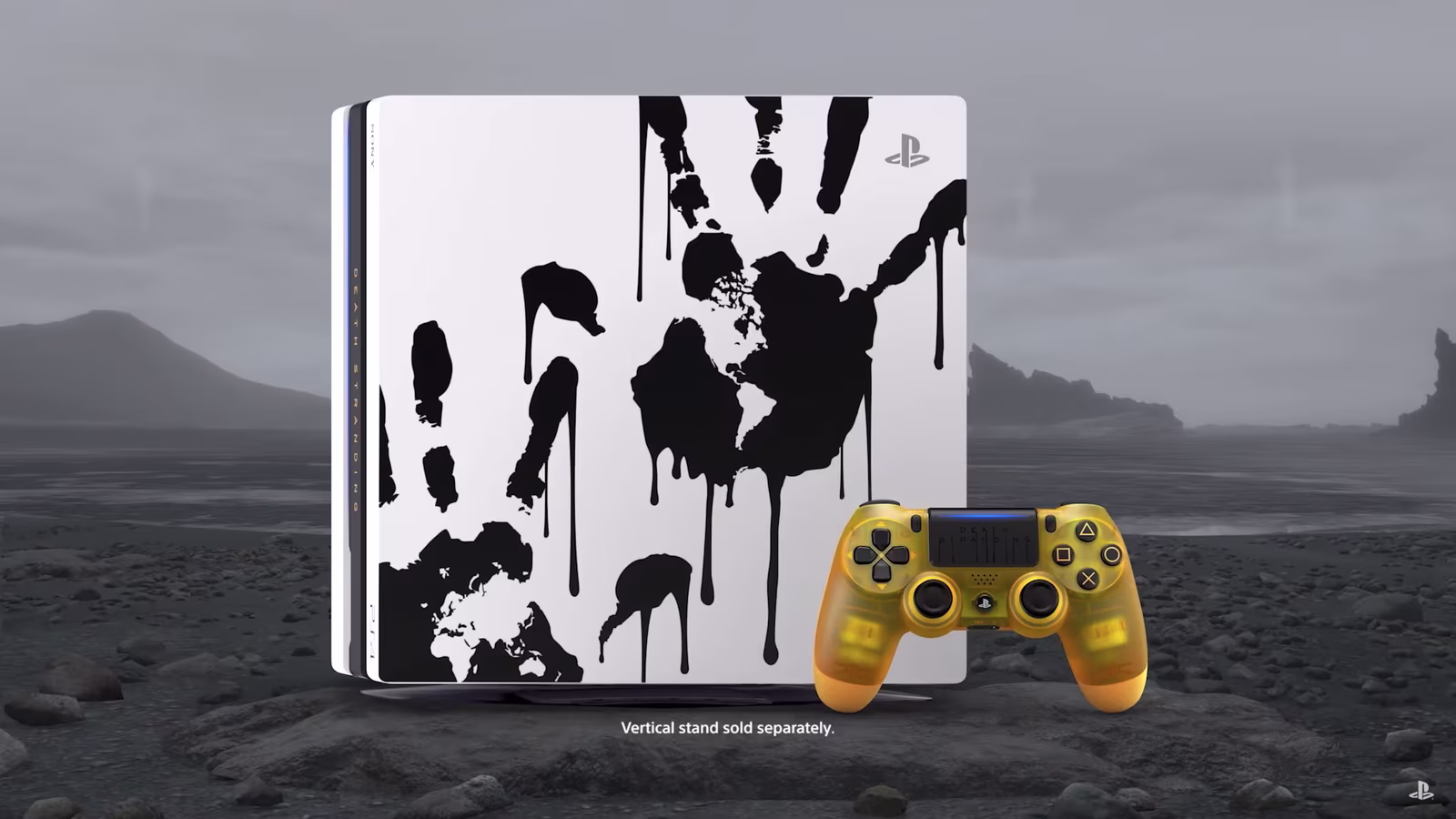 《死亡擱淺》特殊樣式機以純白 PS4 Pro 為基底,側邊中央處以金黃字樣標註英文名稱「Death Stranding」字樣, 同梱 DualShock 4 無線控制器與遊戲中的 BB 圓艙模型相同設計,搭配貫穿全作的神秘手印,讓人印象深刻。