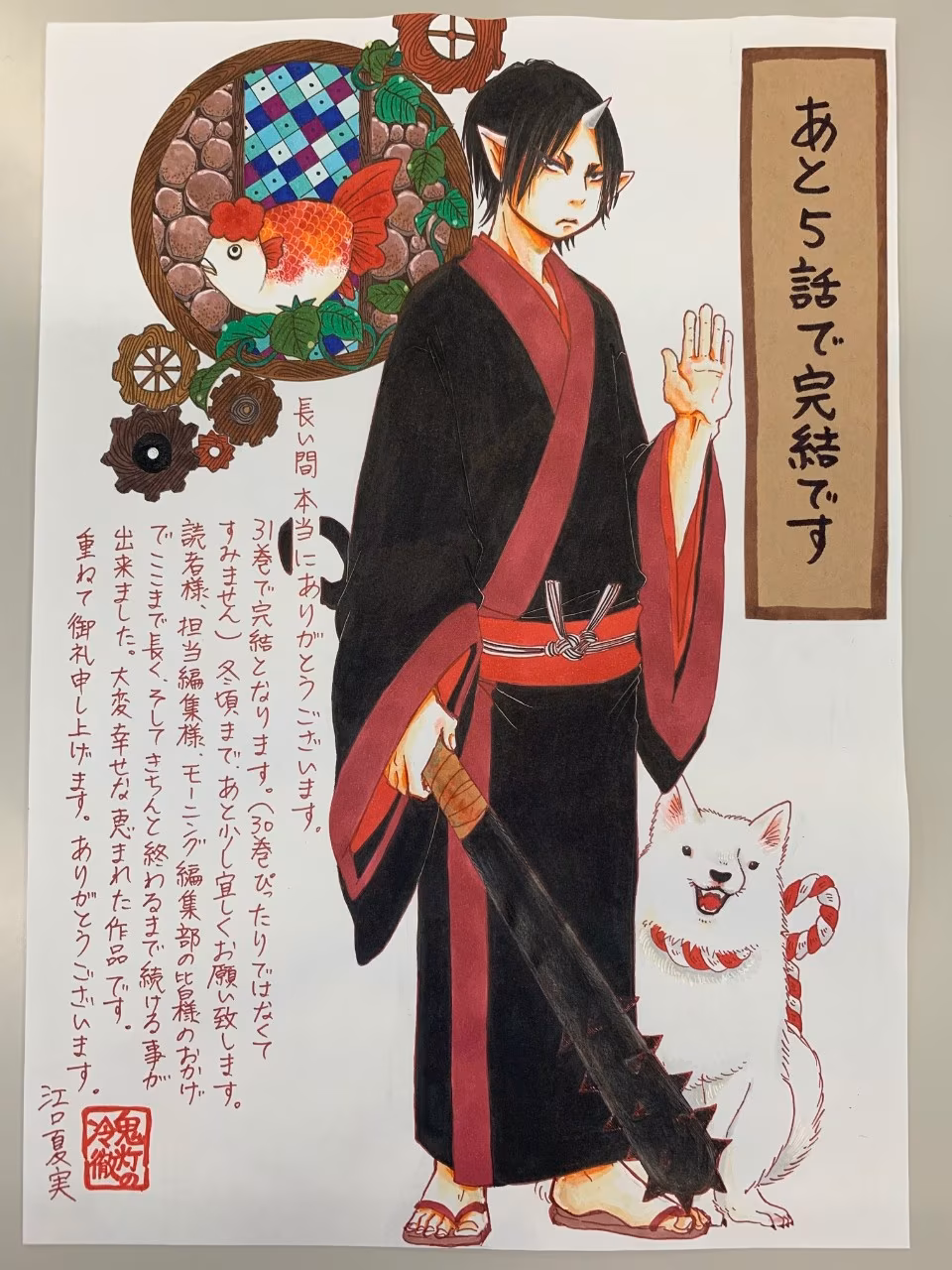 《鬼燈的冷澈》預計會在單行本第 31 集完結(沒有剛好在第 30 集完結真的很不好意思),直到冬季來臨前還請各位再多多指教。