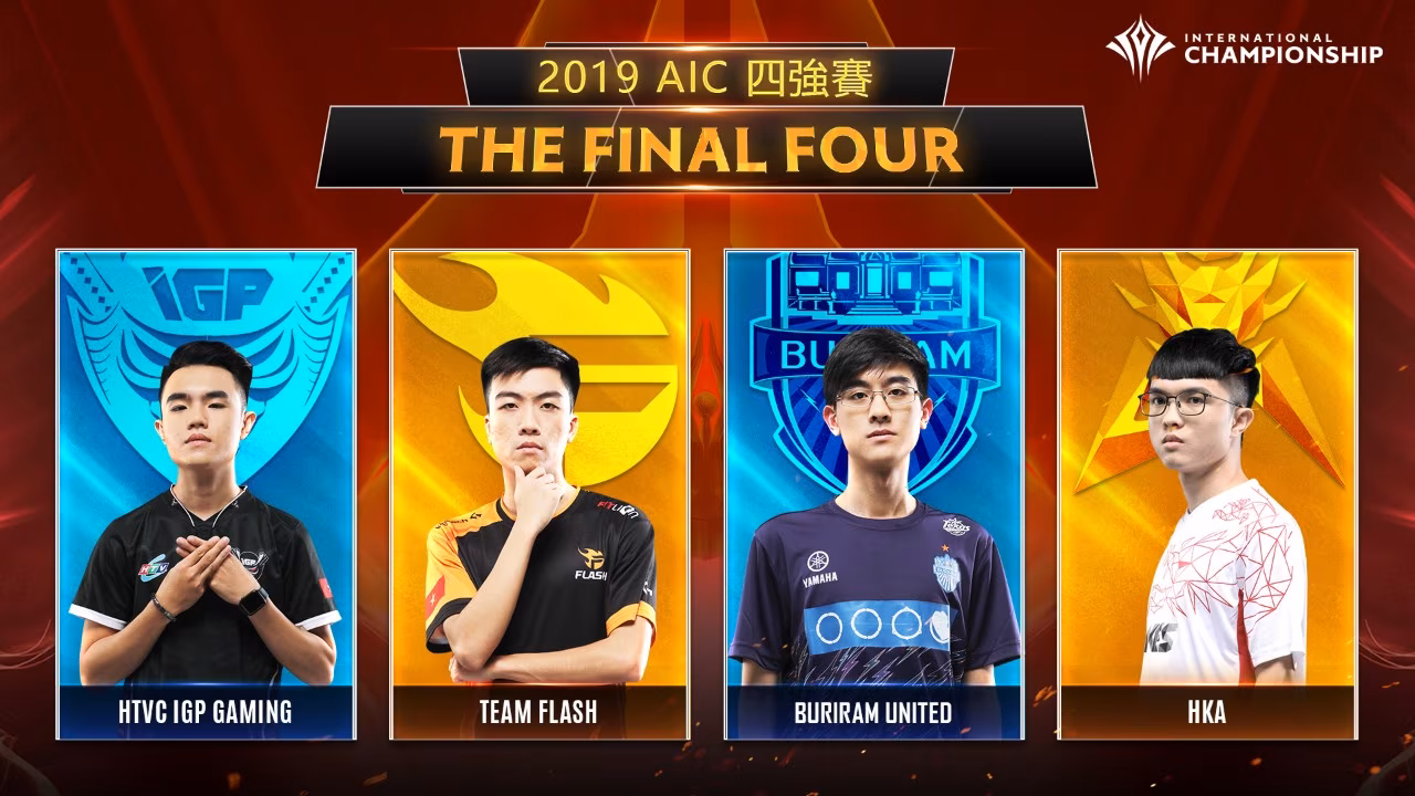 《Garena傳說對決》2019 AIC 國際賽四強名單出爐,GCS 賽區代表隊 HKA 於內戰中擊敗 ONE Team 強勢挺進四強,將與越南 AOG 賽區的 Team Flash(FL)、HTVC IGP Gaming(IGP)以及泰國 RPL 賽區的 Buriram United(BRU),四隊菁英隊伍一同爭奪《傳說對決》國際賽事最高榮耀!