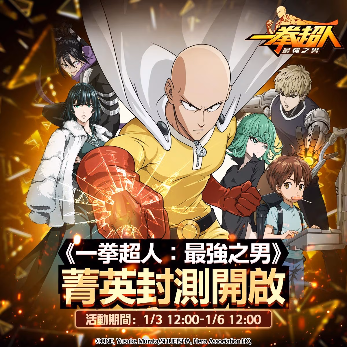 由日本集英社在內版權委員會監修,玩蟹科技開發的 2D 策略卡牌戰鬥手遊《一拳超人:最強之男》預約人數已突破50萬人次大關。期間限定菁英刪檔封測將於 1 月 3 日中午 12 點起 Android 平台限時開放四天。凡取得封測資格玩家,登錄遊戲即可獲得登錄豪華大禮、封測專屬好禮等,加入最強除蟲大作戰行列一起除害,更有機會獲得獨享禮包。