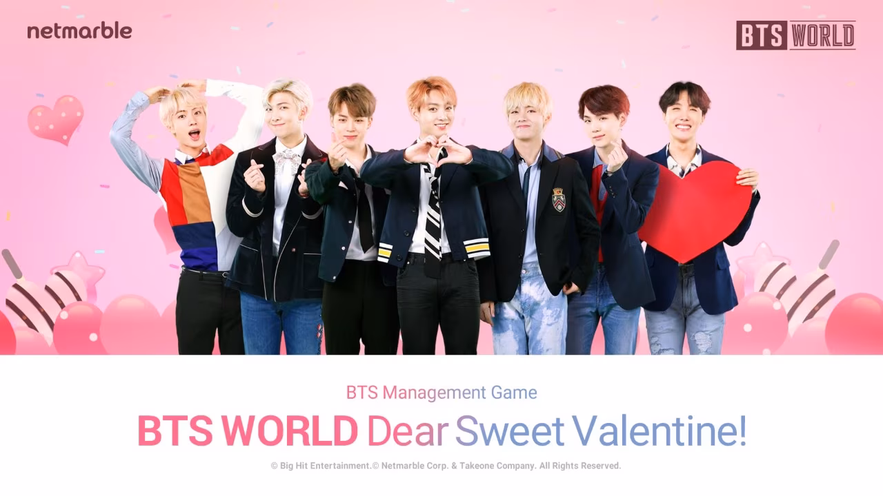 從 2 月 11 日起,加入《BTS WORLD》情人節更新包含:全新情人節主題活動關卡和故事,並有 7 張全新 5 星卡,此外還有可以在「造型」中使用的全新情人節貼紙套組,以及超值情人節禮包。