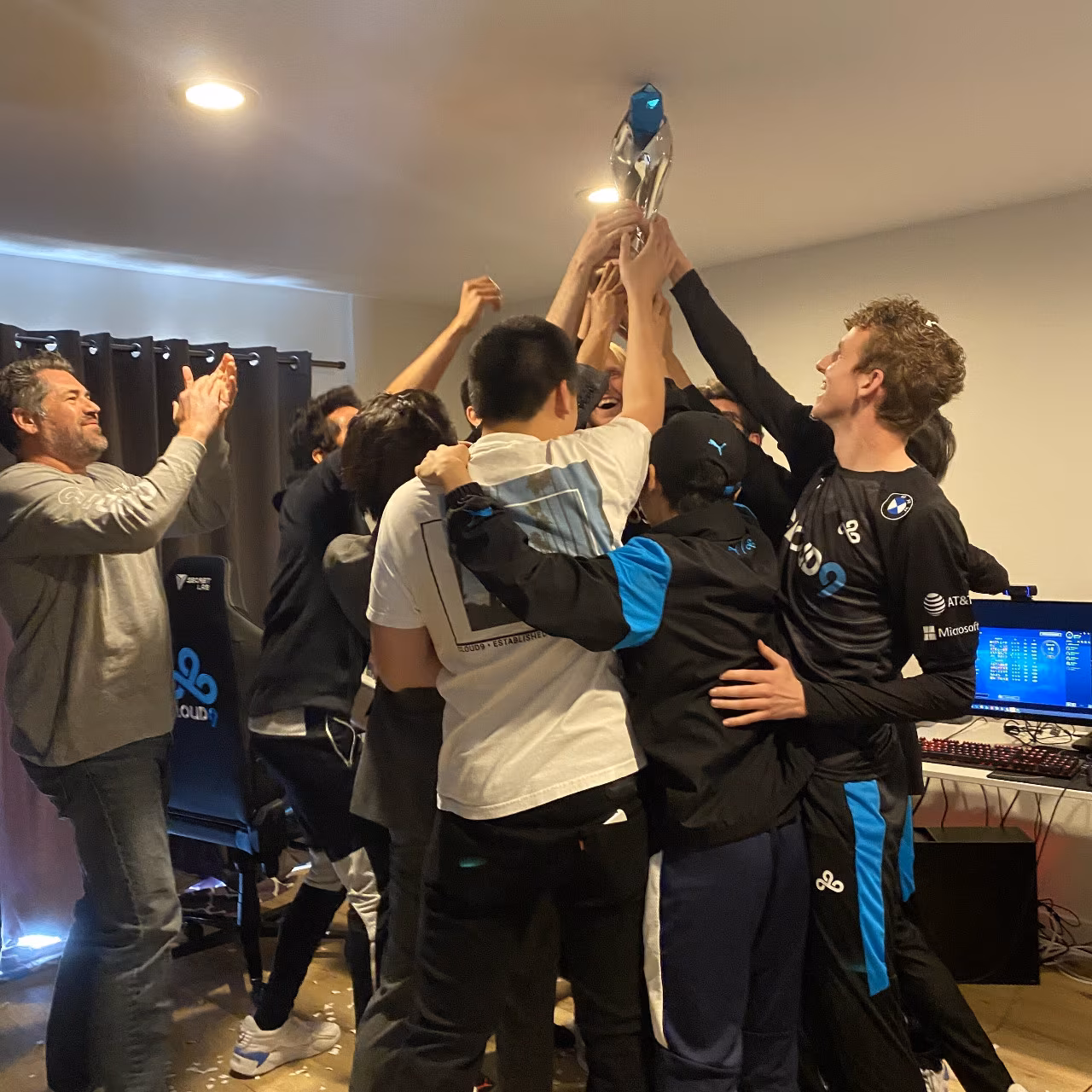 按照 Cloud9 推特的圖片,疑似是選手們在休息室舉獎盃大肆慶祝時,不小心讓獎盃撞上了天花板,結果獎盃中間頂端的寶石凹了進去,不過這下子得拜託 Riot 幫忙修理了。