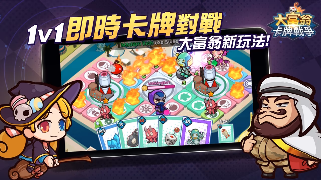 熟悉的大富翁道具「飛彈、地雷」全都變成卡牌囉!全新玩法的《大富翁卡牌戰爭》將顛覆你對大富翁的想像,利用多元的「角色技能」及「卡牌策略」組合,想儘辦法奪取對手金錢,最終讓對手破產即贏得勝利!選擇一起並肩作戰的大富翁明星,與全台灣玩家來一場 5 分鐘對決吧!